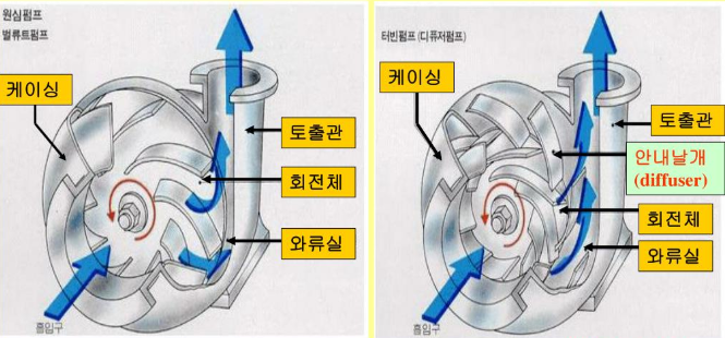 *터빈 펌프에서 임펠러 선단에 안내날개(guide vane)를 정착 => 고압을 만들고 진공으로 만들어 높은 곳에 물을 보낼 수 있음. (고양정용이라고도 함)